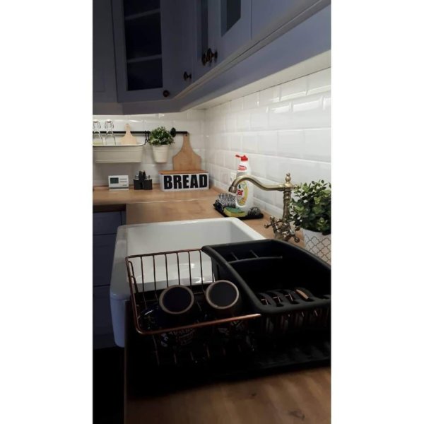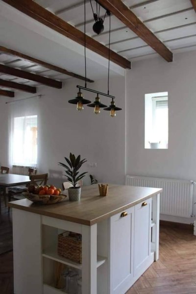 Tisztelegve a múltjának, megőrizve a karakterét vidékies stílusú konyhát terveztem, hagyományos halszálka parkettát megidéző járólapozással, ami újra nagy divat a nagy terekben.